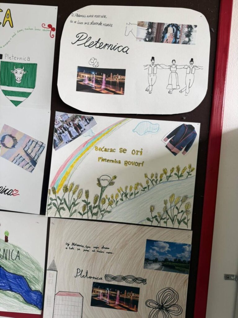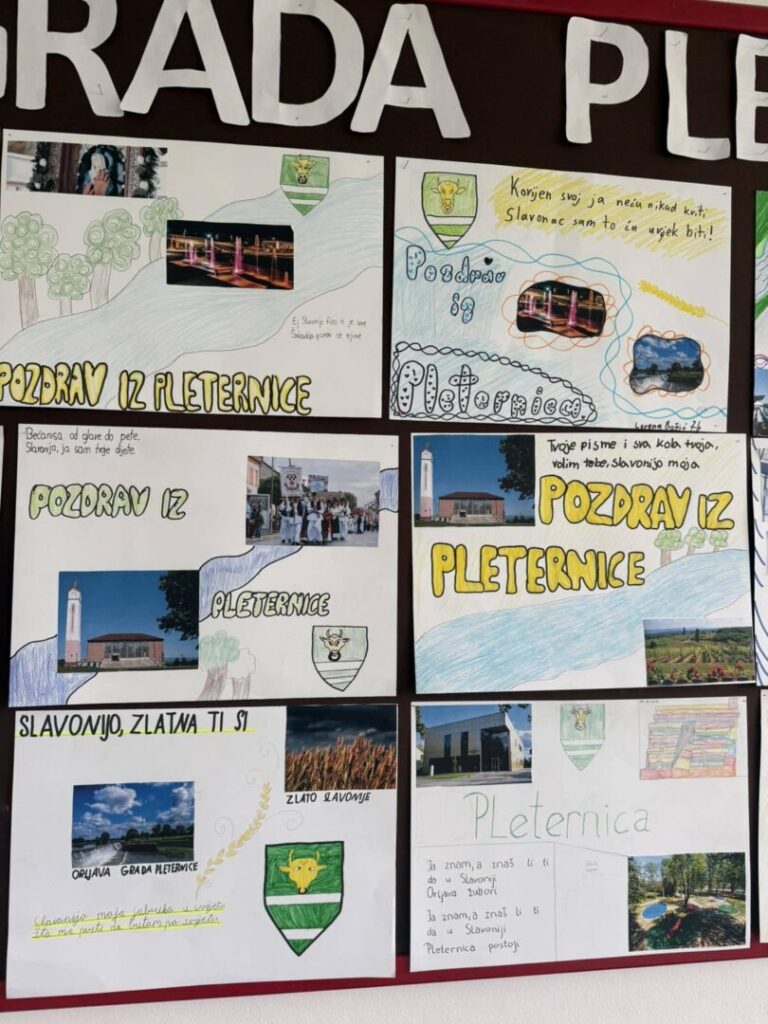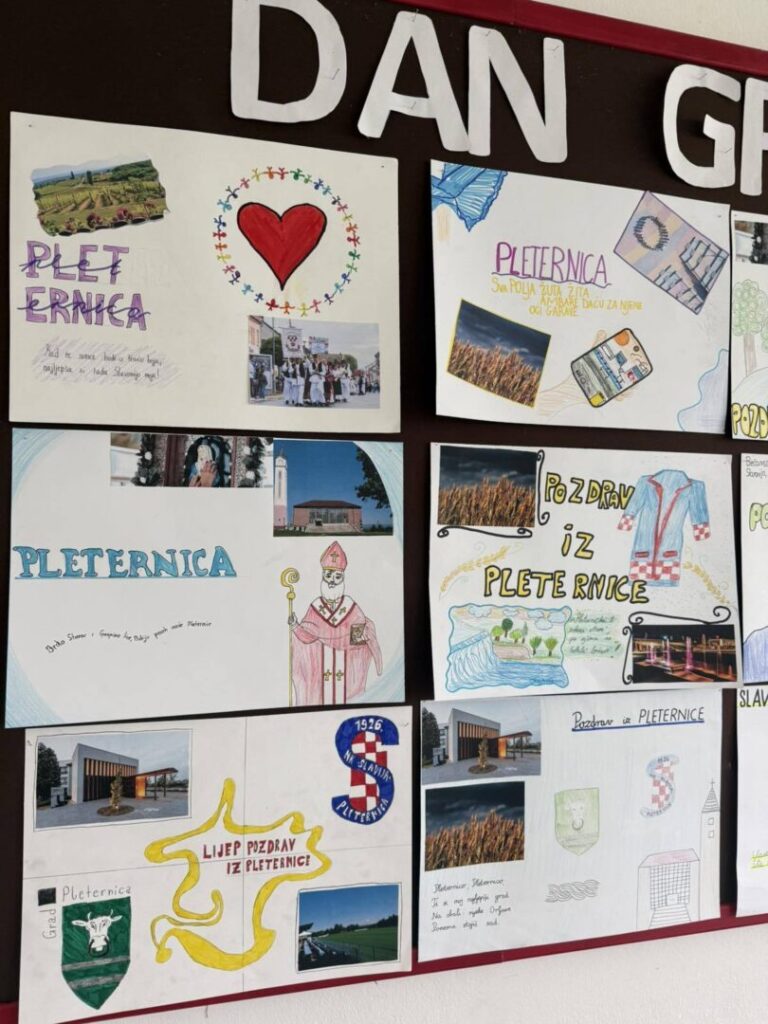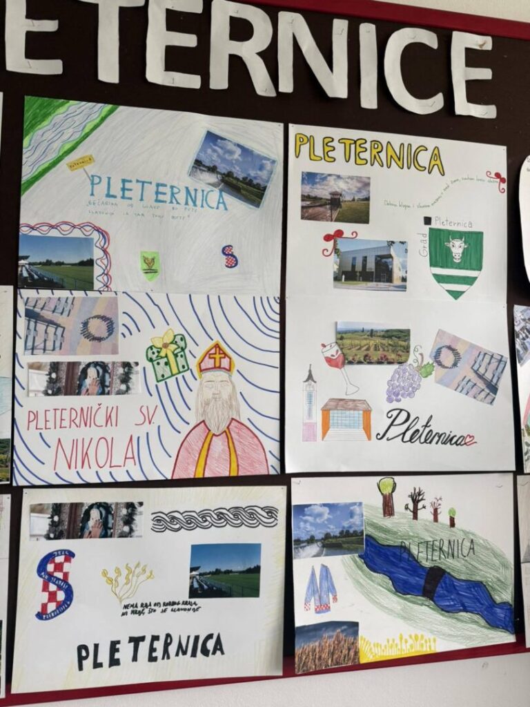 Povodom Dana grada Pleternice i blagdana svetog Nikole biskupa, zaštitnika našega grada, učenici sedmih razreda s učiteljicom Enom Uremović izrađivali su razglednice posvećene našem gradu – gradu bećarca. Cilj radionice bio je osvijestiti važnost očuvanja kulturne baštine, a učenici su kroz likovni izraz istraživali motive koji pričaju priču o identitetu Pleternice: od kulturnih simbola i prirodnih ljepota do glazbenog nasljeđa koje je duboko utkano u život našega kraja. Radovi odražavaju njihov trud, maštu i ponos prema gradu u kojem žive.