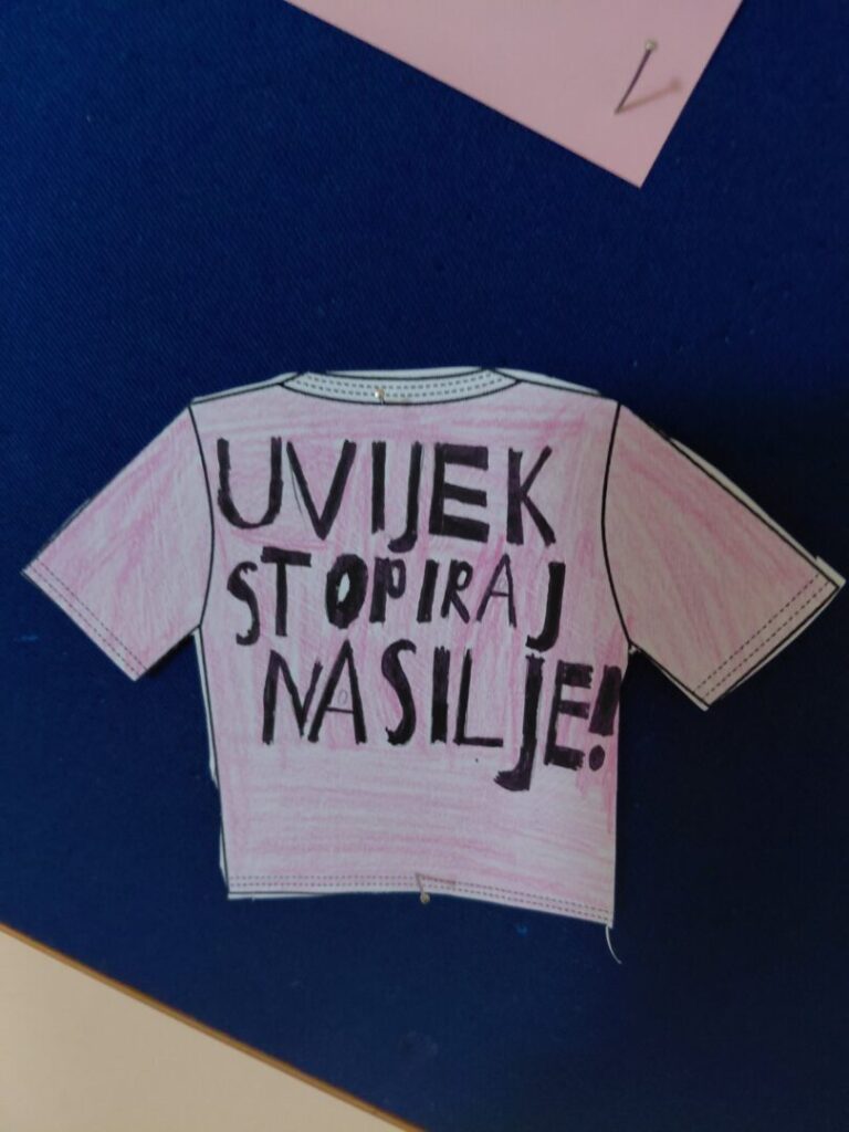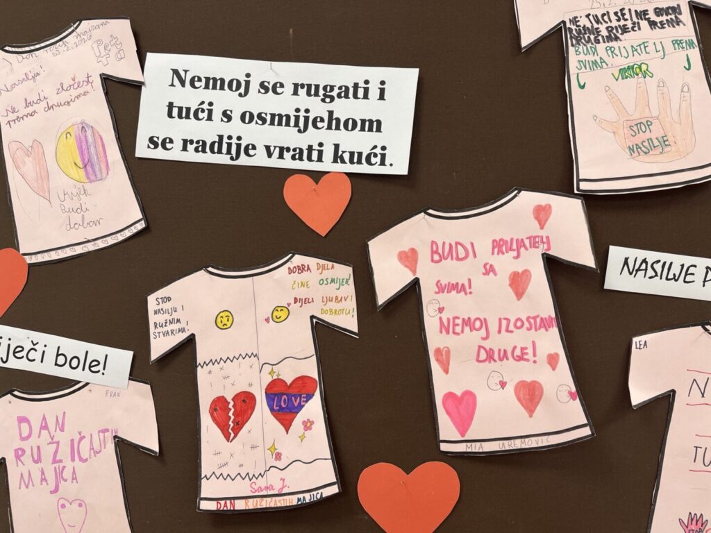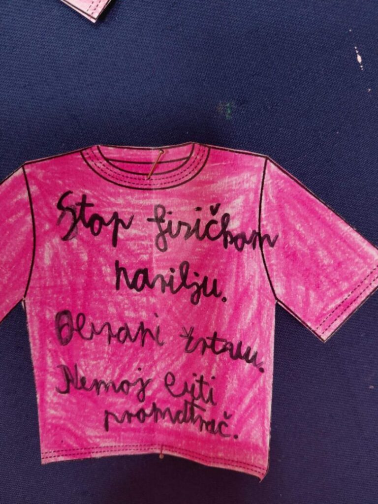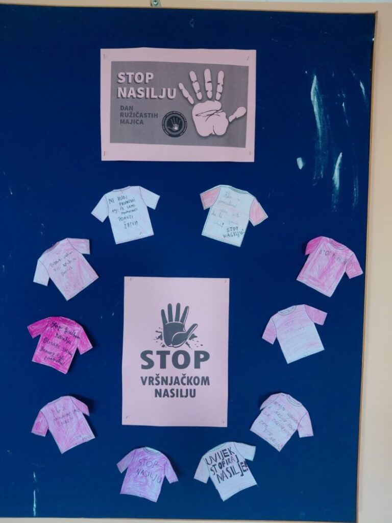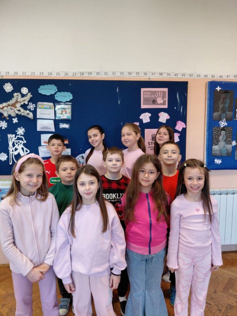 – Učenici 3. a razreda i učiteljica Ksenija Barišić odjenuvši ružičaste majice naučili su da ne postoje muške i ženske boje. Tijekom radionice osvijestili su razliku između sukoba i nasilja te samostalno navodili primjere ponašanja kojima uvijek trebamo reći NE i ponašanja kojima trebamo reći DA. Poruke su ispisali i uredili razredni pano suglasni u istome: