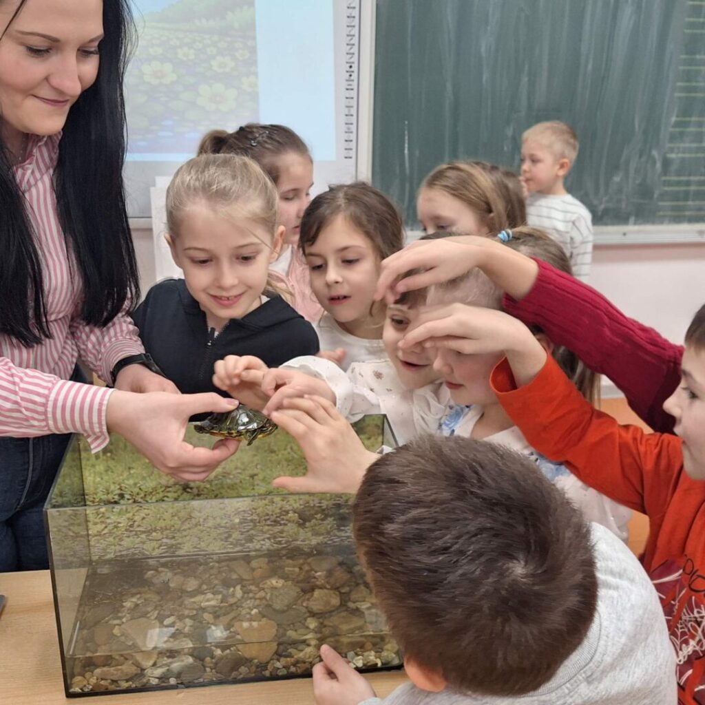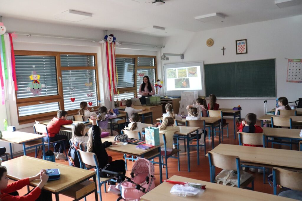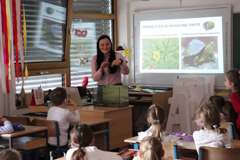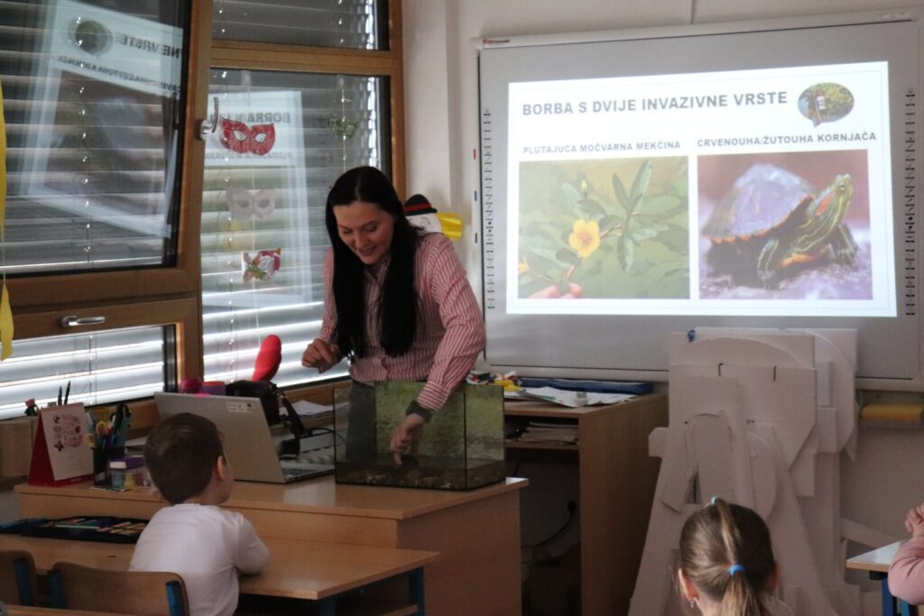 Učenici su aktivno sudjelovali i kroz radionicu i razgovor naučili više o zaštiti prirode i invazivnim vrstama, a posebno se razgovaralo o tome kako prepoznati crvenouhu kornjaču koja se pojavila u susjedstvu. Posebno oduševljenje izazvalo je to što su učenici mogli uživo vidjeti crvenouhe kornjače koje su naši gosti donijeli u akvariju – znatiželji i pitanjima nije bilo kraja!